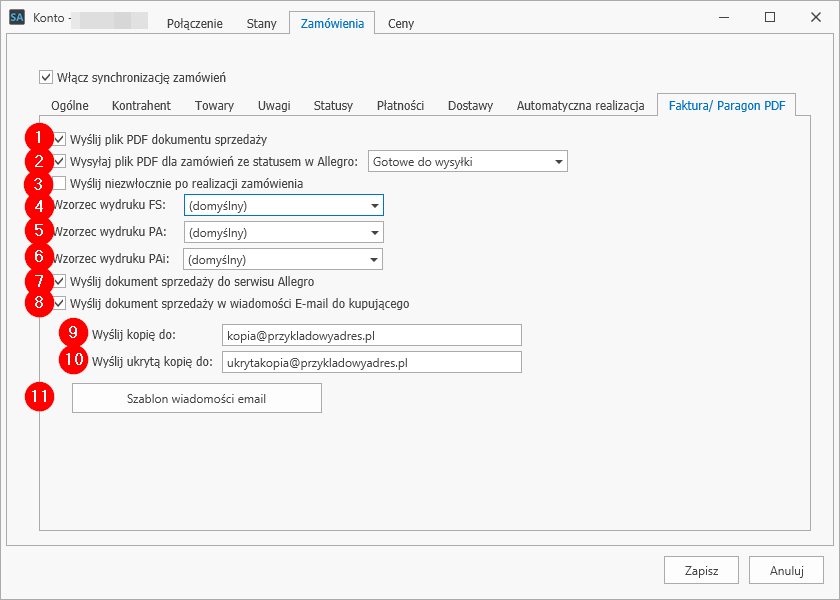 Ustawienia zakładki Faktura / Paragon PDF pozwalają skonfigurować automatyczną wysyłkę wygenerowanych w Subiekcie dokumentów sprzedaży (faktur, paragonów) w postaci plików PDF. Pliki te mogą zostać przesłane do dedykowanego miejsca w serwisie Allegro lub bezpośrednio do klienta przy użyciu wiadomości e-mail.