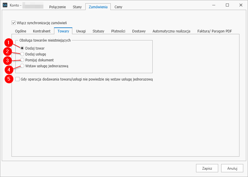 Włączenie opcji spowoduje, że zamówienia będą zawsze realizowane jako dokumenty sprzedaży, niezależnie od sposobu odbioru. - Automatycznie realizuj zamówienia z płatnością przy odbiorze – w przypadku zamówień z płatnością przy odbiorze może zachodzić konieczność ich pobrania do Subiekta, żeby rezerwowały stany magazynowe, jednak dokumenty sprzedaży musiałyby zostać wystawione dopiero wtedy, gdy zamawiający odbiorą zamówienia. Taką funkcjonalność realizuje Synchronizator, gdy opcja pozostaje wyłączona. Zamówienie z płatnością przy odbiorze nie zostanie nigdy zrealizowane automatycznie i trzeba to będzie zrobić manualnie.