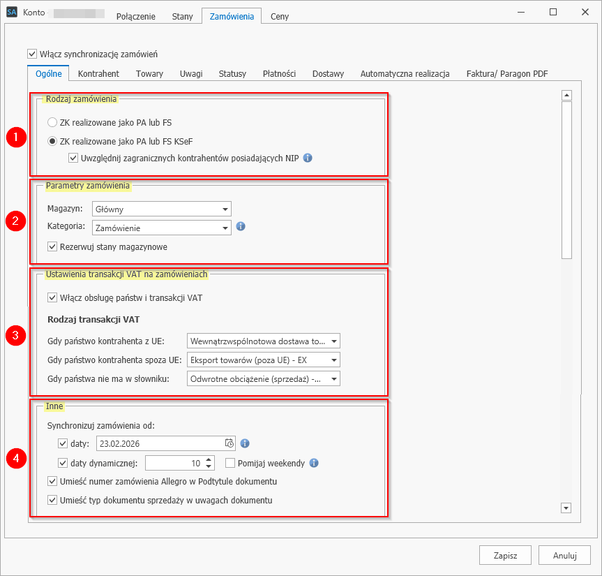 - Synchronizuj zamówienia od – wybór daty, od której będą pobierane zamówienia do Subiekta;