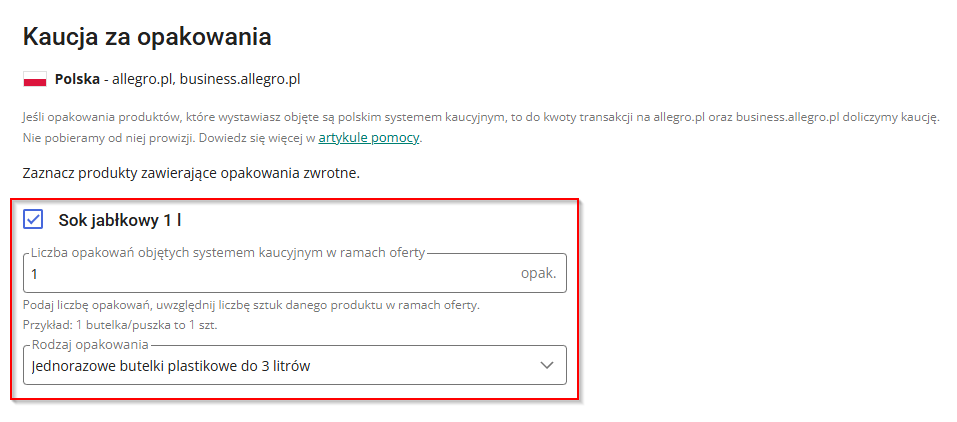 Na poniższym rysunku pokazano prawidłowe ustawienie kaucji w Allegro: