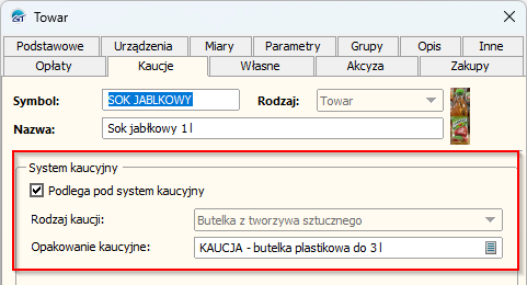 - W Subiekcie: Towar musi mieć włączoną obsługę kaucji i zdefiniowane opakowanie.