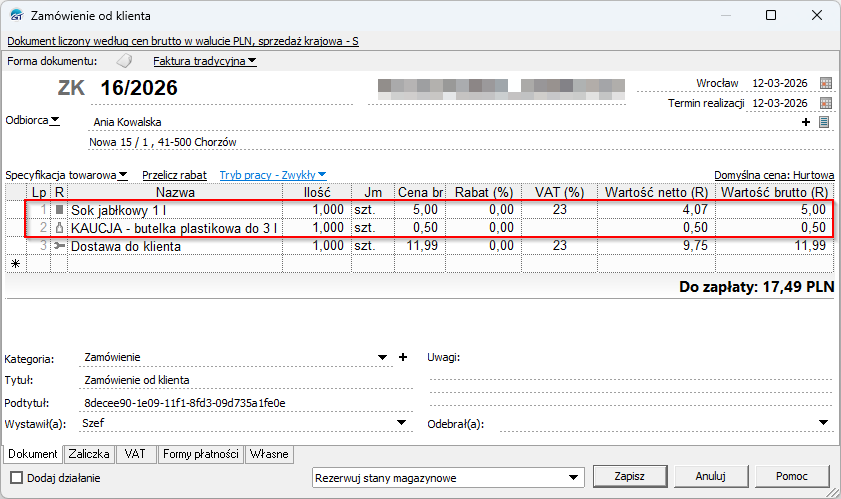 Zamówienie dodane do Subiekta GT wg powyższych ustawień będzie zawierało zakupiony towar wraz z kaucją (rys. poniżej):