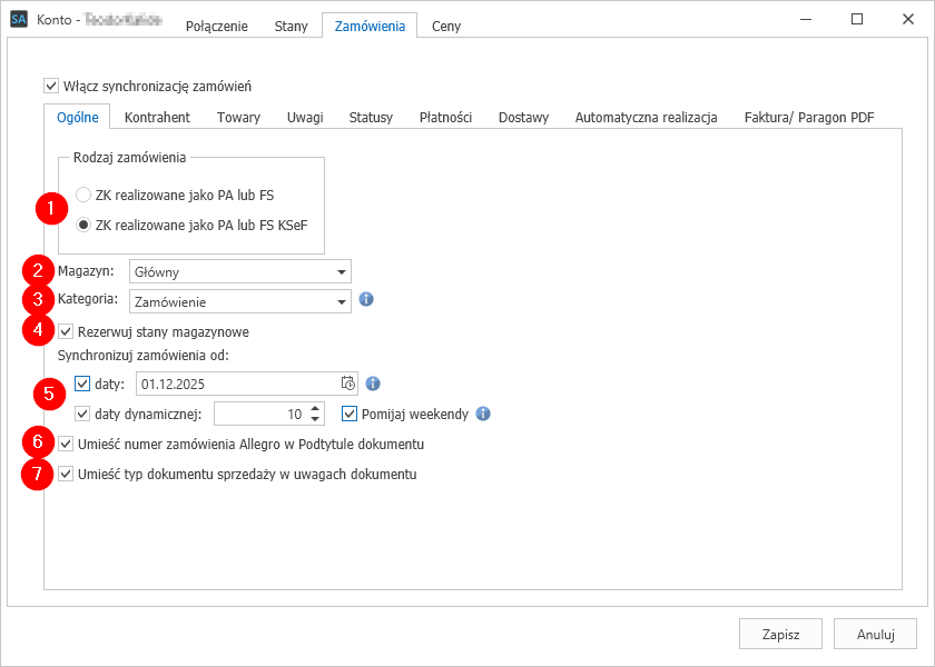 - Synchronizuj zamówienia od – wybór daty, od której będą pobierane zamówienia do Subiekta