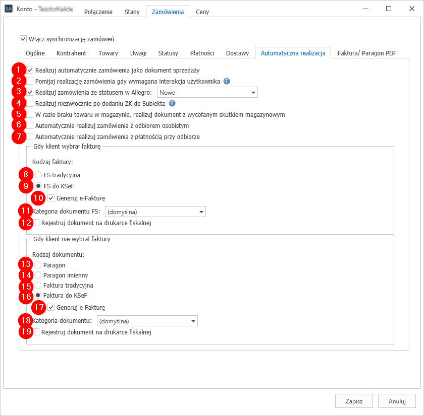- Włączenie znacznika spowoduje, że jako dokumenty sprzedaży będą realizowane jedynie te zamówienia, które w serwisie Allegro mają ustawione wskazane statusy.