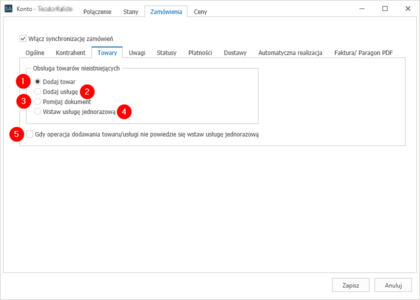 - Zaznaczenie opcji spowoduje, że na zamówienie w Subiekcie zostanie wstawiona usługa jednorazowa w przypadku, gdy podczas próby dodania towaru do Subiekta wystąpiły błędy