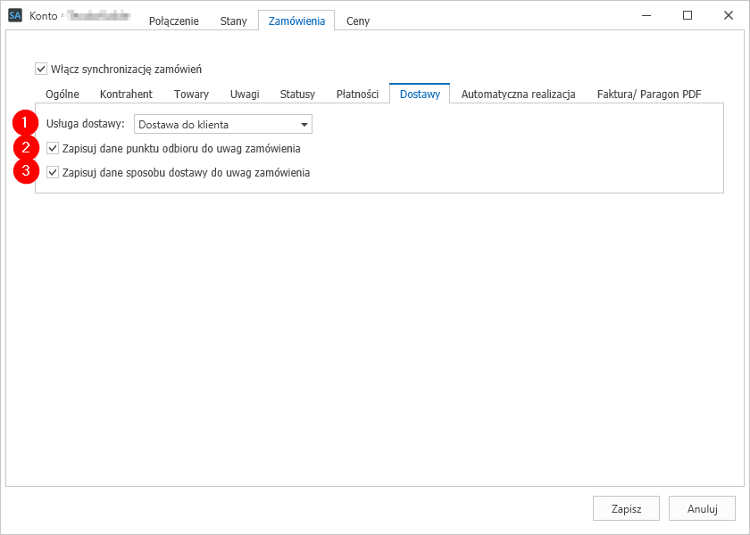 - Włączenie znacznika spowoduje, że do uwag do zamówienia zostanie wpisany sposób dostawy.